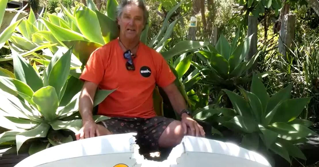 Ungefähr 10 Sekunden nachdem er unter Wasser gezogen wurde und etwas auf die Stelle spritzte, ist McDonald im Swellnet-Video beim Wiederauftauchen zu sehen. Während er mit ABC sprach, saß er hinter seinem Surfbrett, das an der Seite eine etwa einen Fuß breite, markante, bissförmige Lücke aufwies.