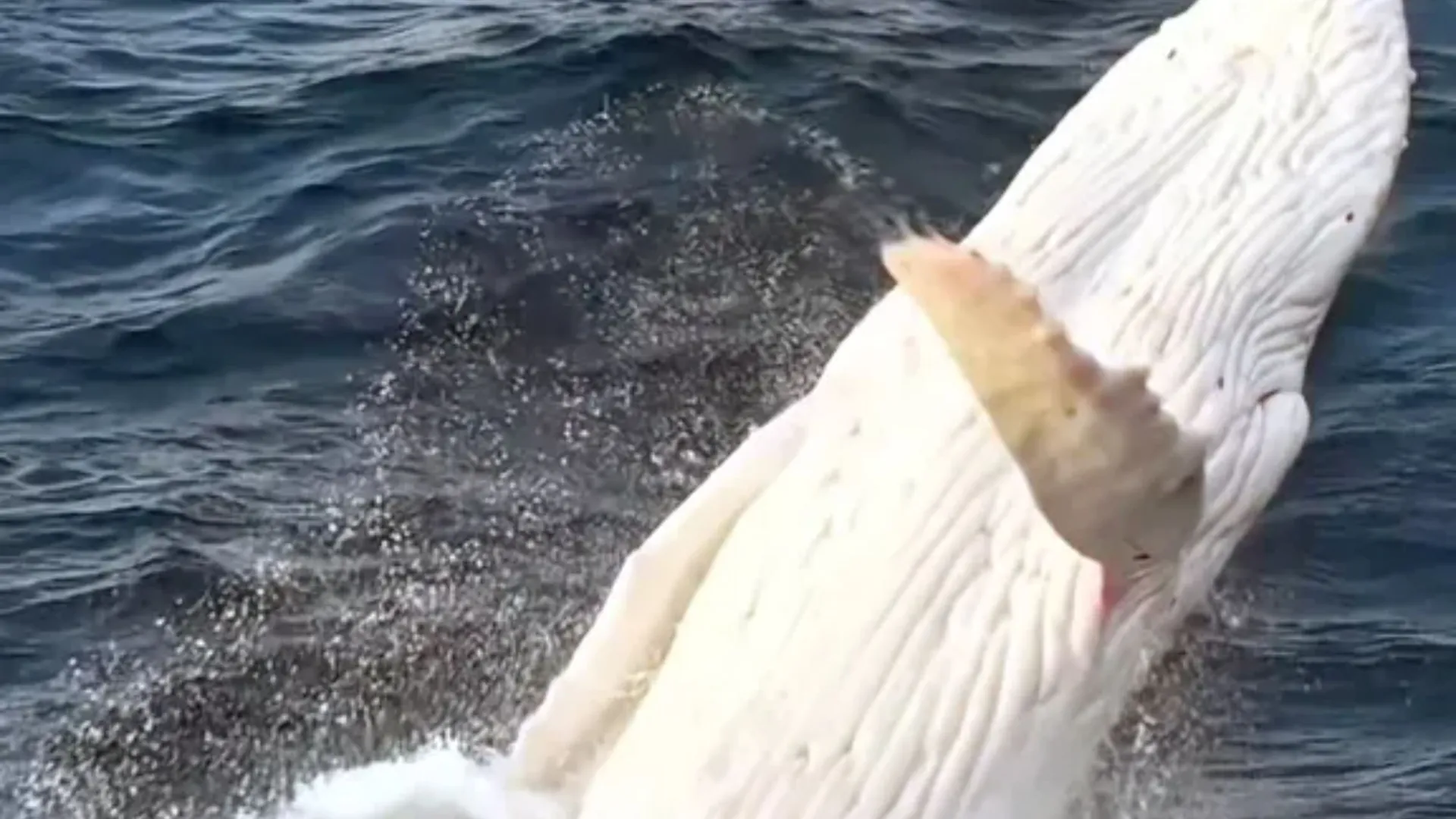 Start Nachrichten Unglaublicher Moment, in dem ein ganz weißer Albino-Buckelwal aus dem Wasser springt...